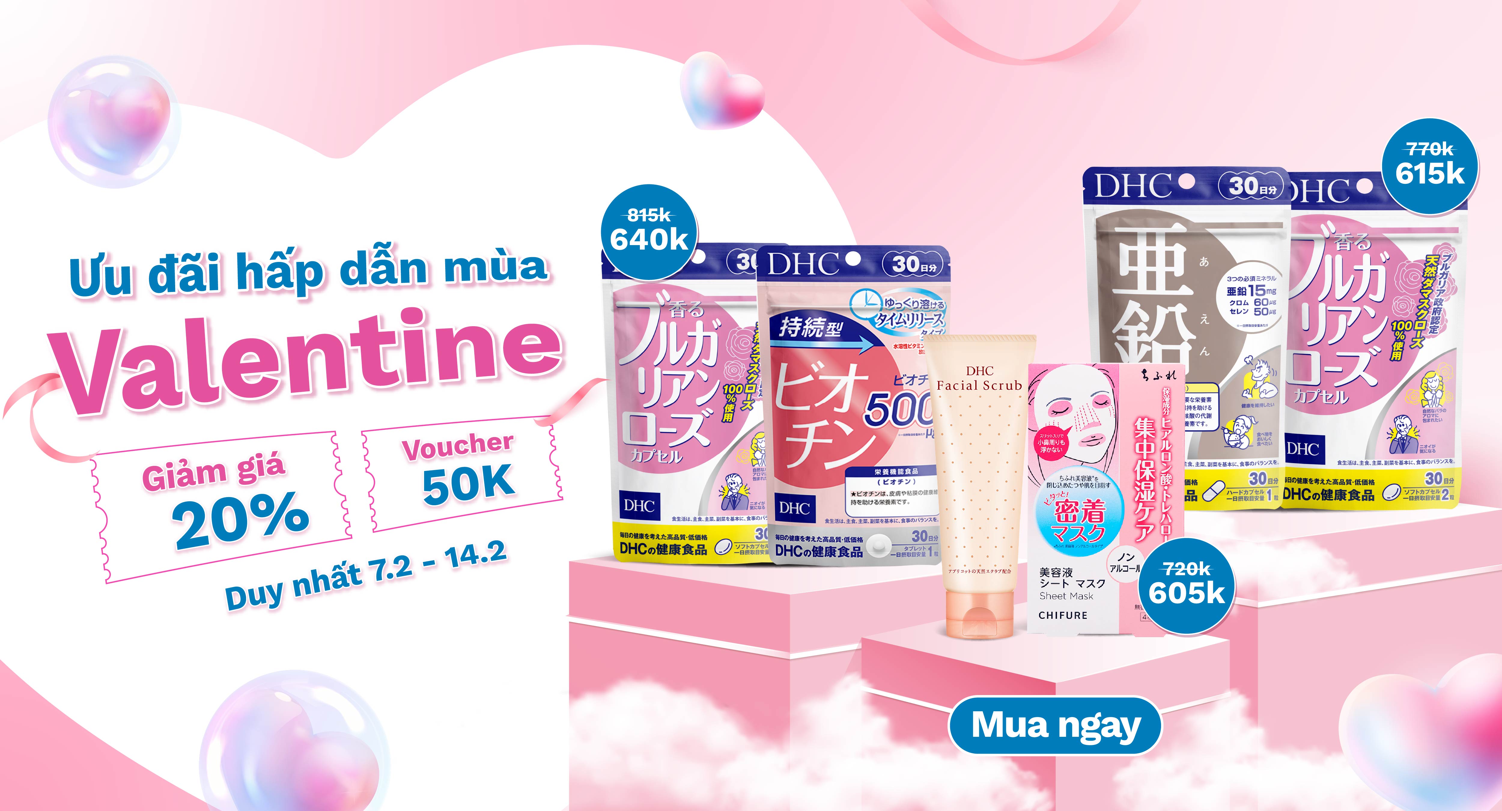 - Combo Vừa trắng vừa mềm mùa Valentine (Kem tẩy tế bào chết DHC Facial Scrub + Mặt nạ Chifure Sheet Mask) (720K 605K) + Tặng 1 gói viên sáng da 30 ngày.